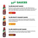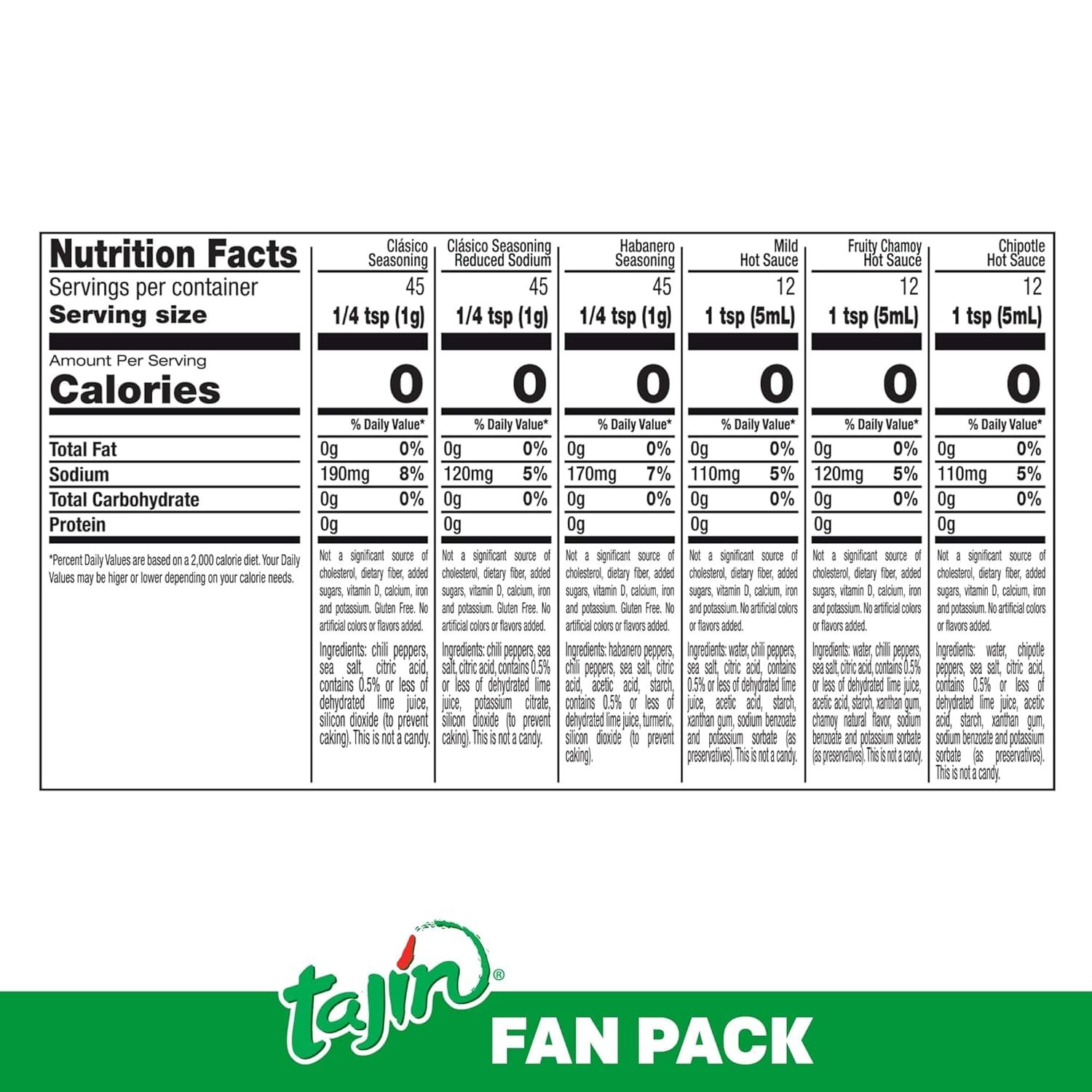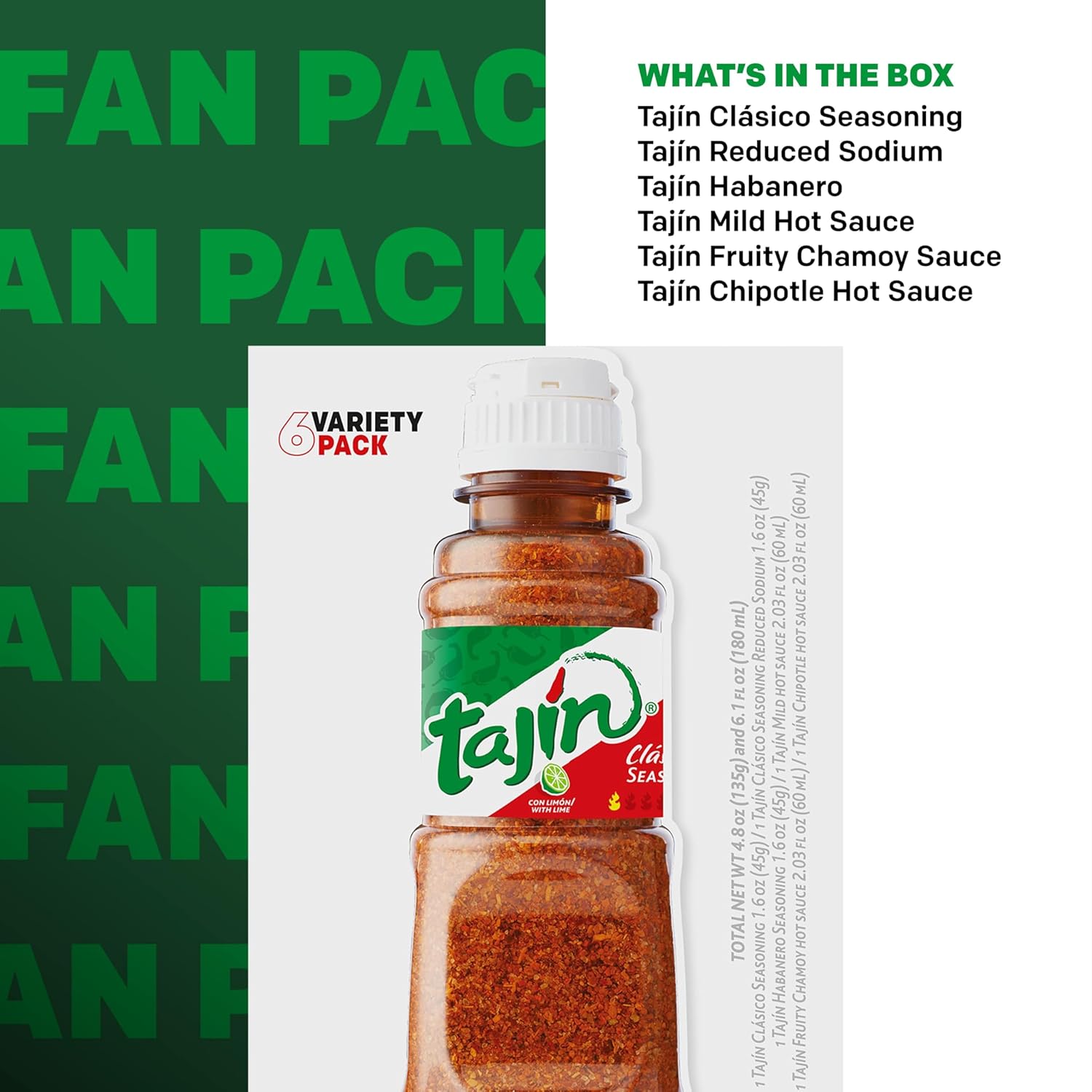 WHAT’S IN THE PACK: Tajín Clásico Seasoning 1.6oz, Tajín Clásico Seasoning Reduced Sodium 1.6oz, Tajín Habanero 1.6oz, Tajín Mild Hot Sauce 2.1 fl oz, Tajín Chamoy Hot Sauce 2.1 fl oz, Tajín Chipotle Hot Sauce 2.1 fl oz.