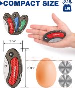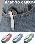 The foldable box cutter has a lightweight aluminum grip handle with a belt clip